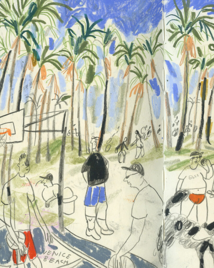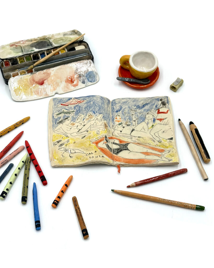 L’exposition chez Tandemm dévoile un voyage à travers ses carnets, où le dessin-reportage devient trace et mémoire. Depuis l’enfance, le croquis accompagne l’artiste, de l’illustration à la céramique, jusqu’à la toile. En voyage, son carnet devient journal visuel : il capte l’instant, nourrit l’imaginaire et fait naître d’autres formes, entre souvenir et création. Son processus débute souvent par des croquis réalisés sur le vif, des gestes d’observation subtils qui se transforment ensuite en compositions intuitives.